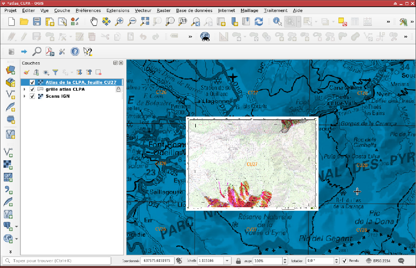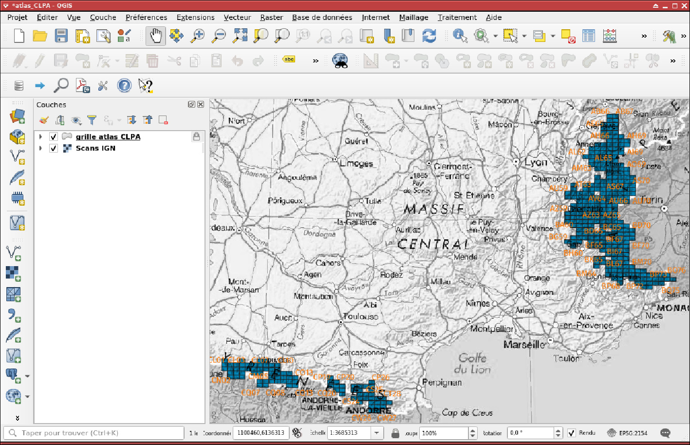 Le fichier QGIS s’ouvre sur une vue d’ensemble des feuilles de l’atlas CLPA disponibles sur les massifs pyrénéen et alpin.