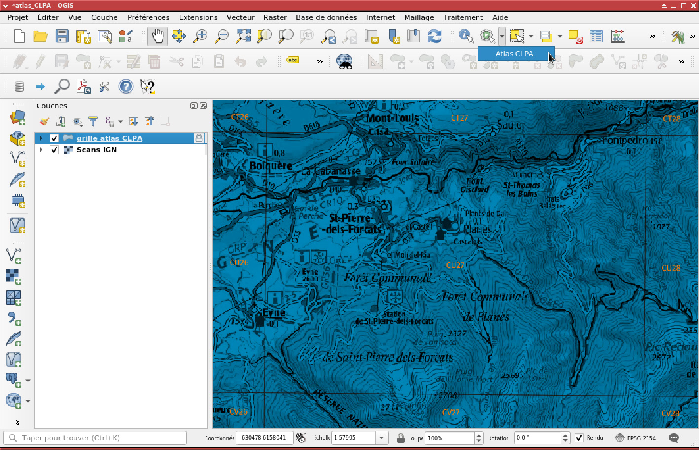 Ouvrir le fichier atlas_CLPA.qgs (il est accompagné d’un fichier nommé atlas_CLPA.gpkg qui doit se trouver dans le même répertoire).
